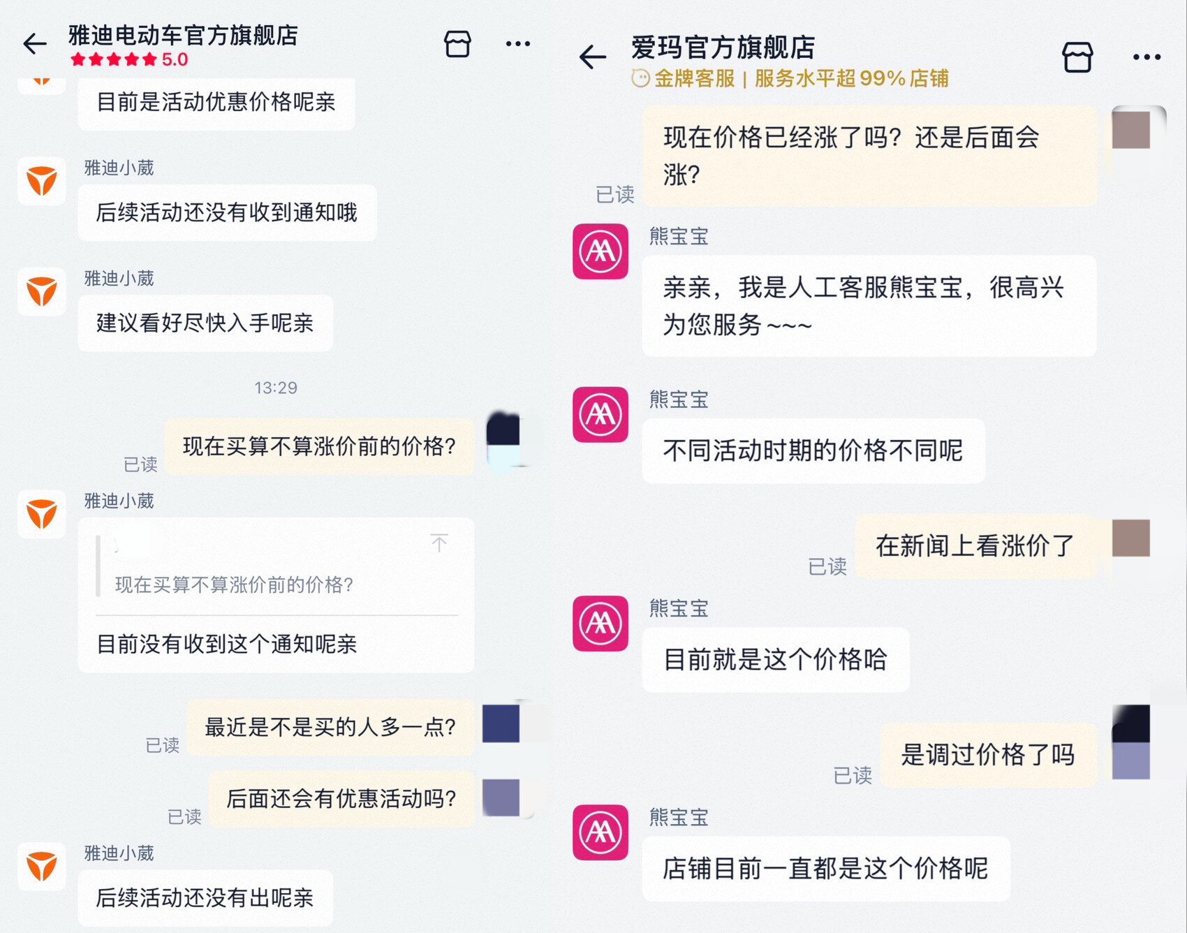 值得注意的是,线上渠道调价节奏相对滞后。记者在电商平台咨询雅迪、爱玛官方旗舰店客服发现,部分客服仍表示“未收到涨价通知”,或以“不同活动价格不同”回应,尚未明确执行调价。