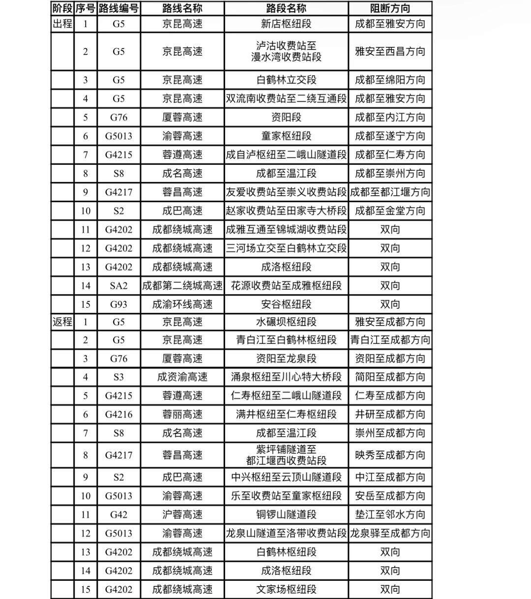 从出行时间看,流量高峰将出现在假期首日10至12时及假期最后一天15至19时,高峰小时流量突破35万辆次,部分车流量集中路段出现短时拥堵。从区域分布看。高速公路网车流量在成都平原和川南等地集中特征明显,全省高速公路流量排名前十的市(州)包括成都、宜宾、泸州、乐山、德阳、南充、眉山、内江、绵阳、广安。