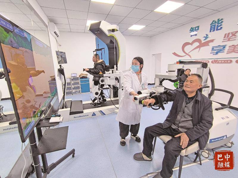 在恩阳区登科社区卫生服务中心,老人正在进行康复训练。