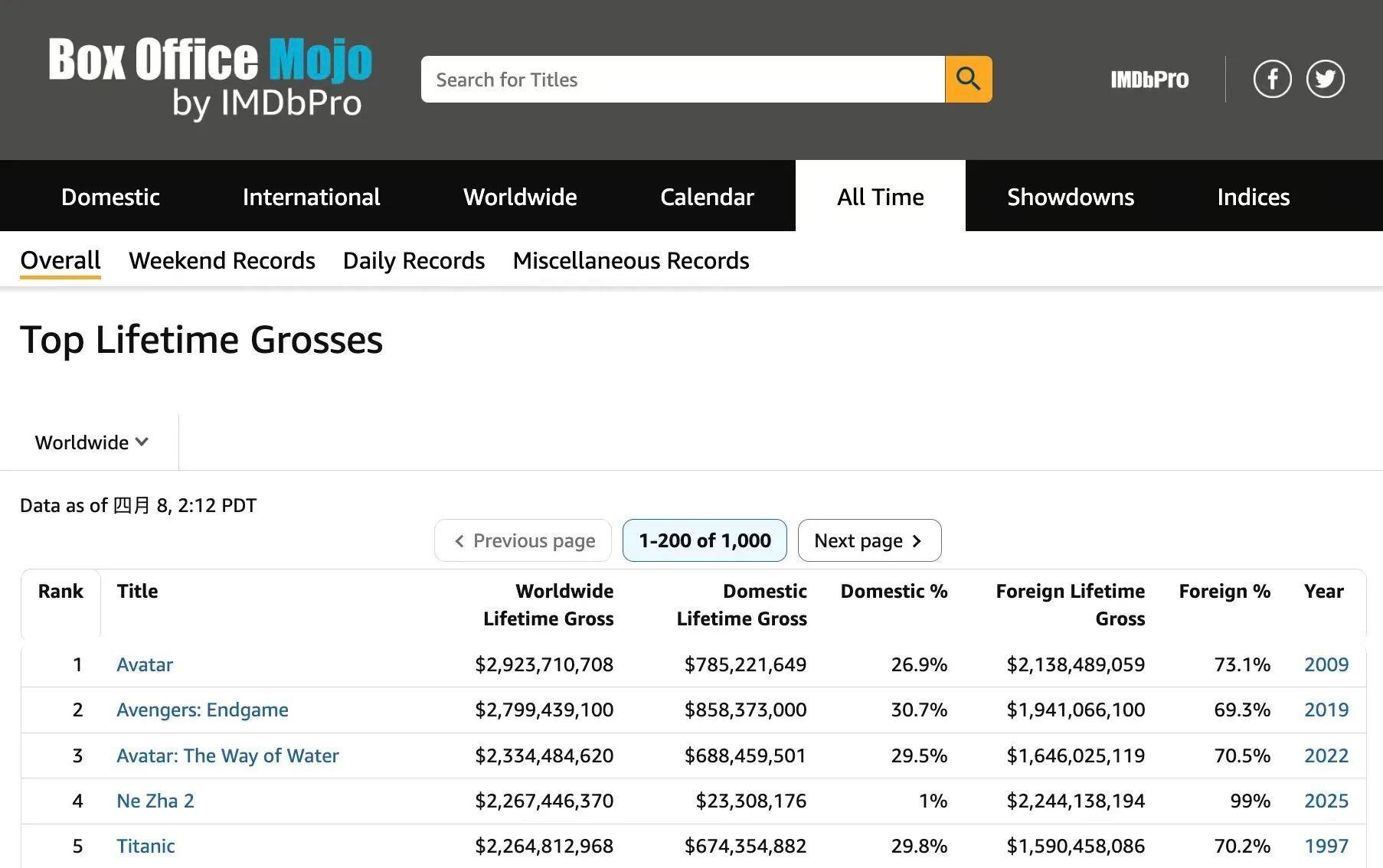 据全球权威票房统计网站Box Office Mojo最新数据显示,“四川造”动画电影《哪吒之魔童闹海》在补录马来西亚地区票房后,全球累计票房达22.674亿美元,正式超越《泰坦尼克号》(22.648亿美元),跻身全球影史票房榜第4位,成为该榜单前十中唯一一部亚洲影片,同时稳居全球动画电影票房冠军宝座。