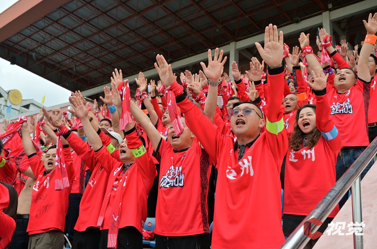 4月11日,“川超”决赛阶段第五轮比赛,德阳重装队主场迎战乐山味道非常队。图为德阳球迷现场呐喊助威。C视觉签约摄影师 陈伟 摄