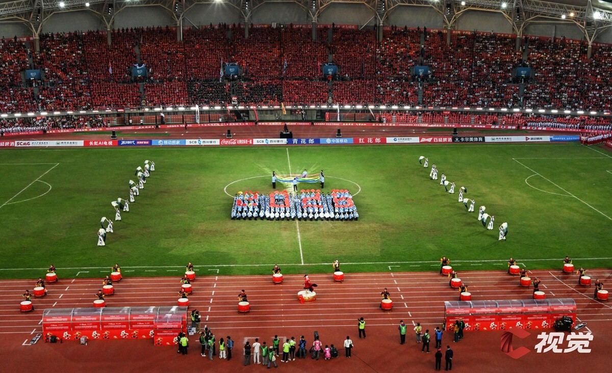 4月11日,“川超”决赛阶段第五轮比赛,自贡灯城燊龙队坐镇自贡南湖体育中心,迎战绵阳九洲长虹队。图为赛前表演。C视觉签约摄影师 杜友山 摄