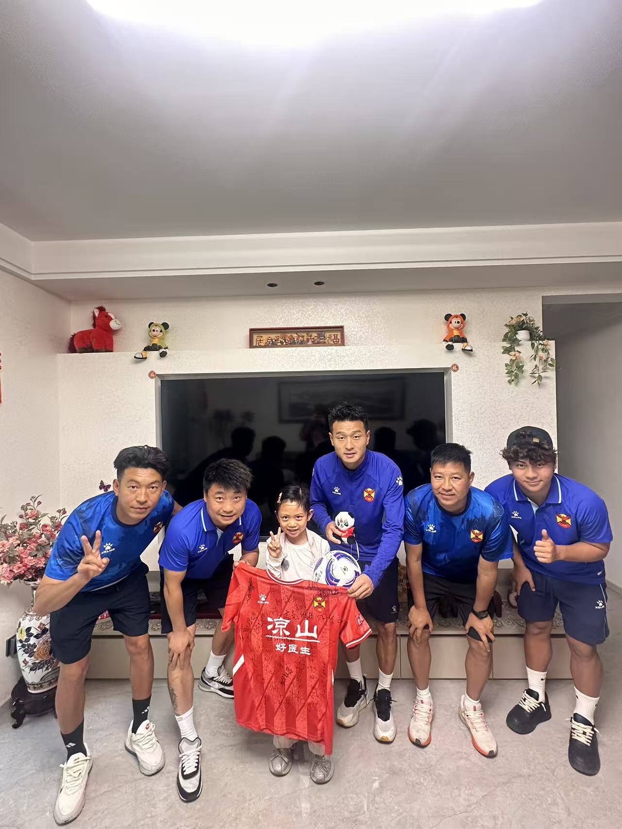 知晓这位小球迷的故事后,凉山好医生队深受触动。为致敬小小“追光者”的勇敢,教练携球员代表一同前往探望,赴一场温暖的双向之约。球员们温柔地问候孩子的身体状况,耐心叮嘱休养注意事项,并送上精心准备的小礼物,用温柔的话语鼓励她勇敢康复、向阳成长。