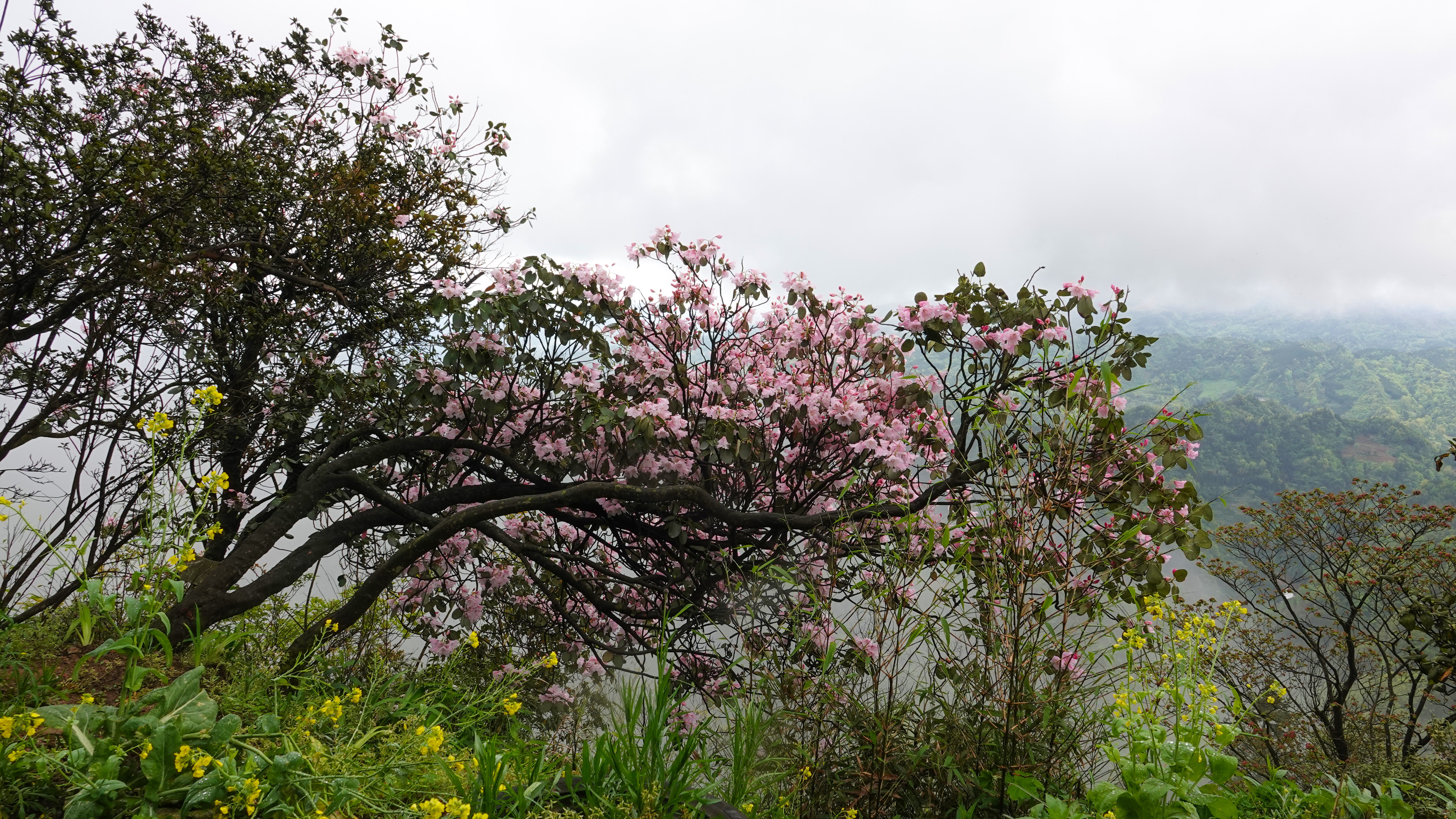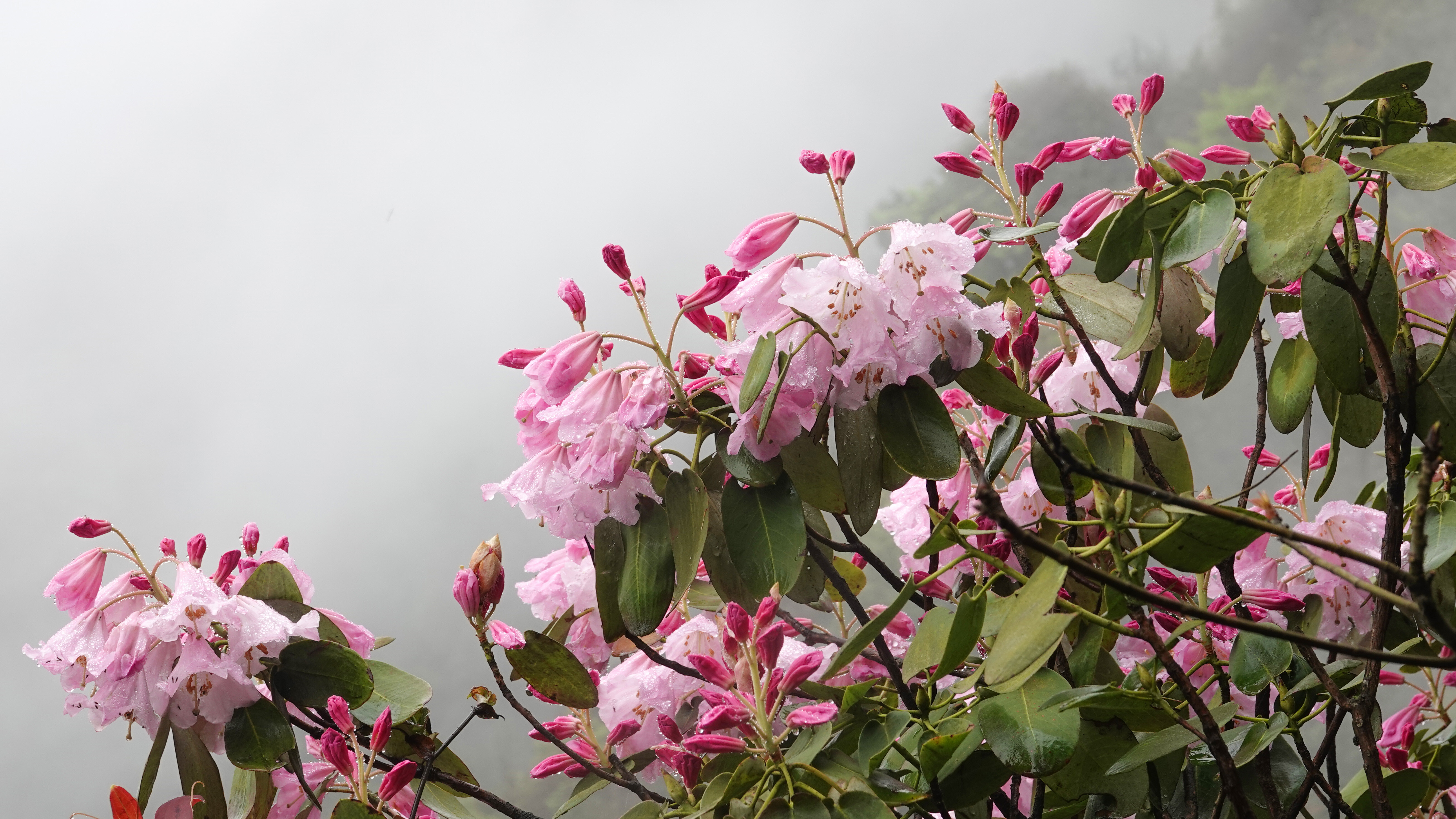 睡莲叶杜鹃是杜鹃花科杜鹃属的珍稀植物,已被列入《世界自然保护联盟红色名录》,保护级别为濒危。它们主要栖息于陡坡悬崖山脊,对生态环境要求极为苛刻。在黄荆老林,睡莲叶杜鹃虽有一定数量的分布,但总体仍属稀少,每至盛花期,成片绽放的景观难得一见。今年受充沛雨量滋养,花势尤为喜人,雨后花朵更显娇艳。