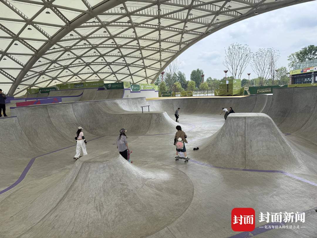 同一时间,十几名滑板爱好者也在碗池场地变换姿势,尝试各种技巧。眉山市民李燕如练习滑板已经有半年多时间,从她家出发到眉山时尚运动公园只有8公里。“以前都在成都滑,今天第一次到这个场馆,感觉很丝滑、很专业。”她说。
