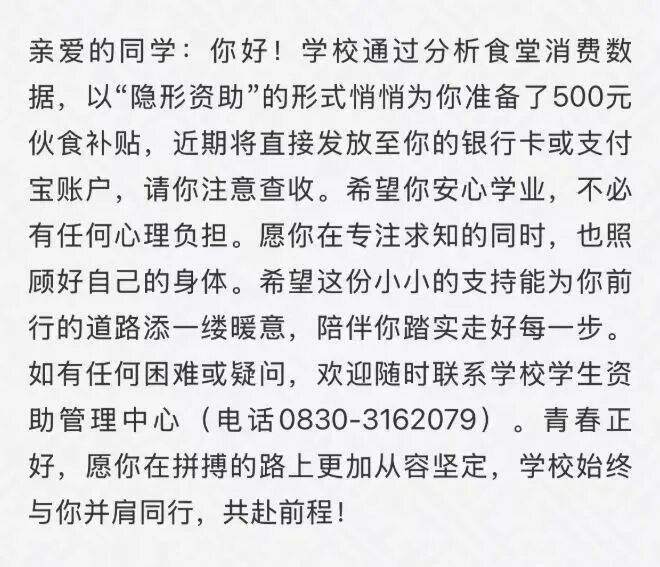 没有公开申请,没有班级评议,更没有张贴公示。一笔补助金悄然汇入账户,随之而来的是一条仅收信人可见的暖心短信——直到这时,许多学生才发现,自己被学校“选中”了。
