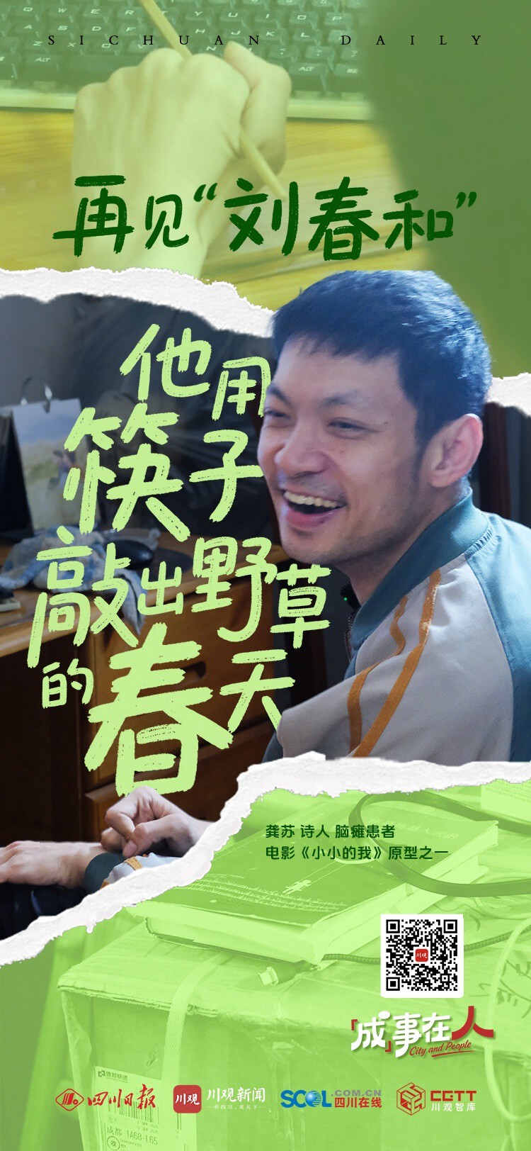 龚苏,36岁,成都诗人,是易烊千玺在电影《小小的我》中饰演的脑瘫患者刘春和的人物原型之一。