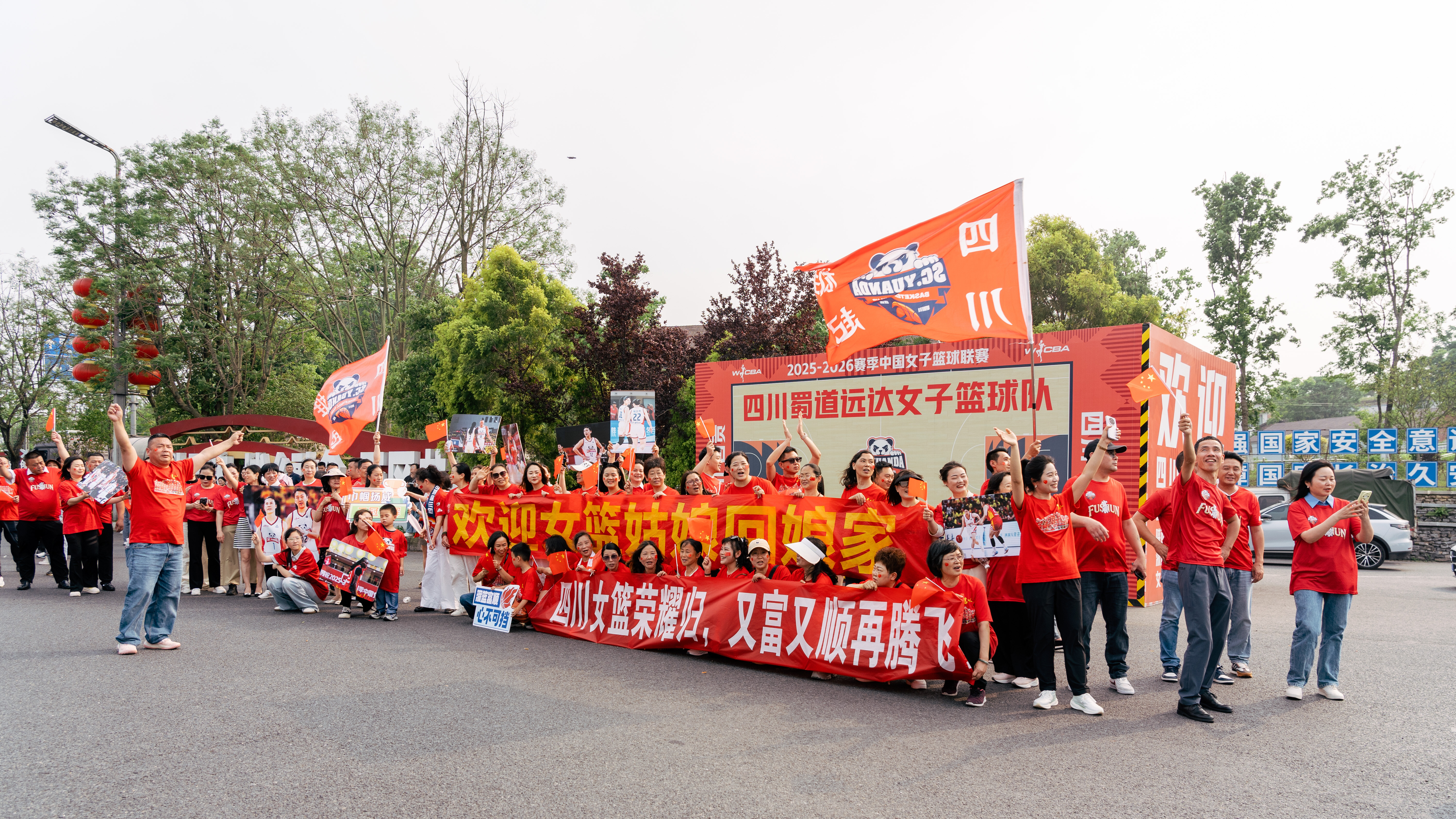 4月26日,夺得WCBA四年三冠的四川蜀道远达女篮载誉归乡,富顺球迷自发聚集高速路口,身着红衣、高举标语,夹道欢迎铿锵玫瑰凯旋。冠军大巴沿县城主干道缓缓巡游,沿途市民挥手欢呼,私家车组成护航车队,全城化作一片红色海洋,共同见证王朝之师与千年古县的双向奔赴。