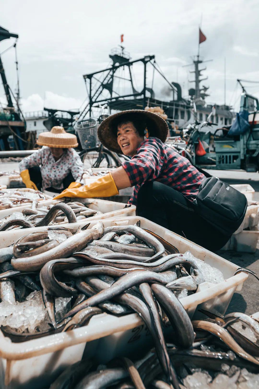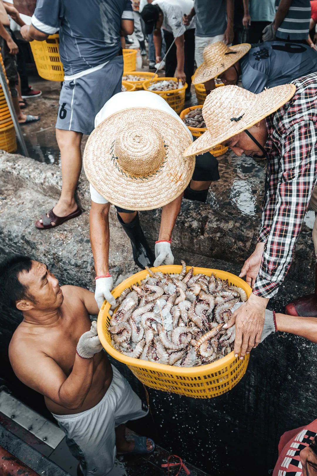 向左滑动。茂名博贺港的渔民与丰收的海鲜。摄影/吴昊