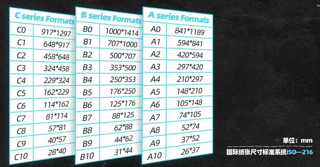 从初始的0号纸来说,A0的面积固定为1㎡,B0的宽度为1m,C0的面积是A0、B0面积的几何平均数,之后,各系列编号为1~10的纸张大小按照对折减半的原则递减。