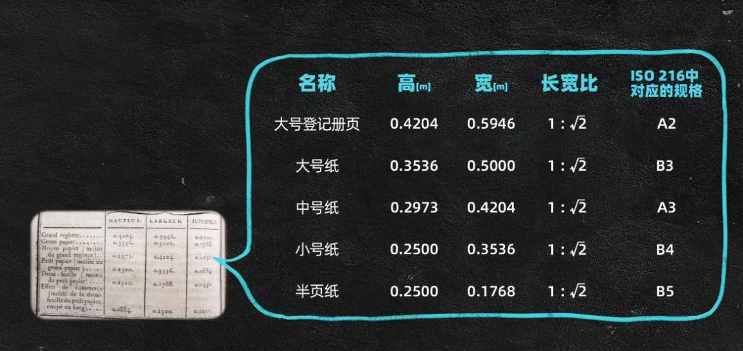 生产和使用上的便利使1:√2逐渐成为纸张标准。1798年,法国颁布了新的印花税法令,规定了包括印花规格、文字标识、纸张尺寸等一整套的单据标准。纸张尺寸中,除最小号的票据外, 其余都符合1:√2的比例,且都能在现今通行的国际标准中找到对应。