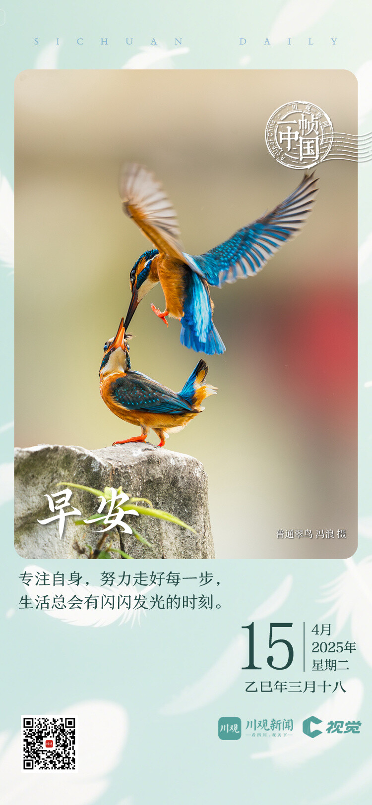 萼绿枝头翠羽鲜,春风早入艳阳天。今天的《一帧中国》,川观新闻带你认识美丽小巧的普通翠鸟。 普通翠鸟是我们最熟悉的翠鸟品种。它们身长16~17厘米,翼展24~26厘米,体重40~45克,上体金属浅蓝绿色,体羽艳丽而具光辉,头顶布满暗蓝绿色和艳翠蓝色细斑。眼下和耳后颈侧白色,体背灰翠蓝色,肩和翅暗绿蓝色,翅上杂有翠蓝色斑。喉部白色,胸部以下呈鲜明的栗棕色。颈侧具白色点斑;下体橙棕色,颏白。橘黄色条带横贯眼部及耳羽为该种区别于蓝耳翠鸟及斑头大翠鸟的识别特征。 普通翠鸟在我国广泛分布,属常见留鸟,单独或成对活动,栖息于有灌丛或疏林、水清澈而缓流的小河、溪涧、湖泊以及灌溉渠等水域。主要以鱼、水生昆虫和甲壳纲动物为食,捕鱼本领很强。 普通翠鸟在中国历史上拥有多种称呼,《尔雅·释鸟》把翠鸟称为“鴗(音lì)”,同“利”谐音,因此推测,翠鸟或许有富贵、财富、吉利的寓意。