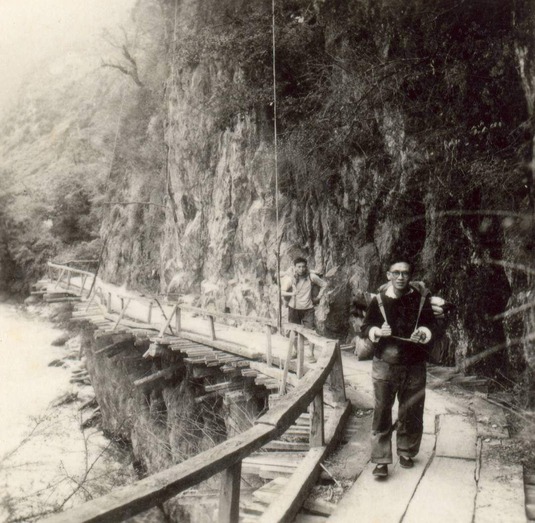 1964年5月,雅安电影公司经理代隐澍和宝兴电影公司王应全前往硗碛放电影途中,经过长扁桥栈道。(代强供图)