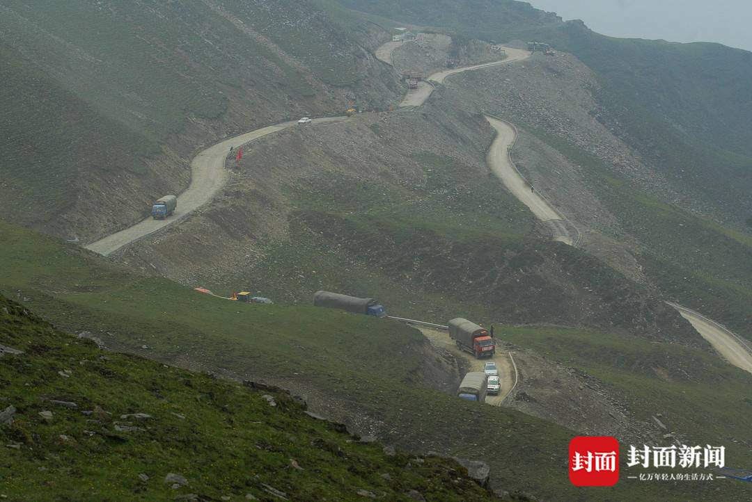2008年6月6日,运送救灾物资的车辆行驶在夹金山的盘山公路上。汶川地震发生后,由于通往地震灾区的道路受阻,大部分物资通过夹金山绕道送往灾区。摄影:杨涛