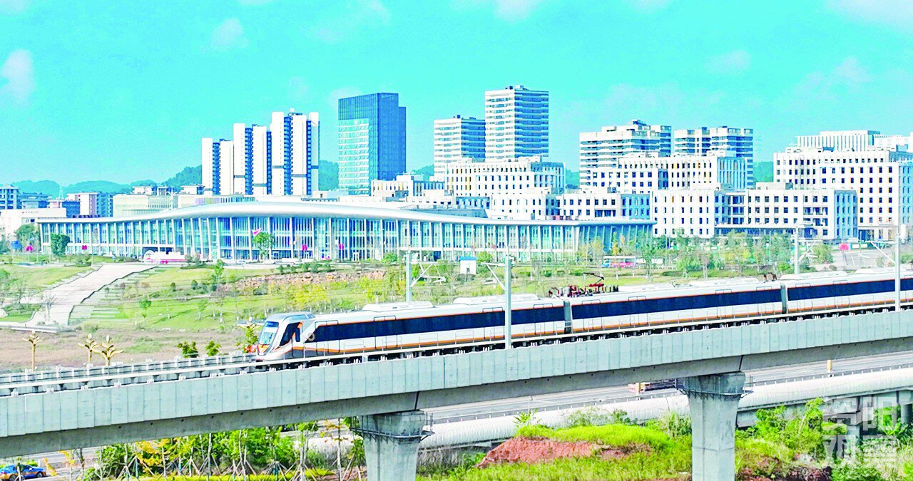 轨道交通资阳线正加速汇成一条强劲的“发展线”,促进成资两地的人才流通与产业协同,推动这座年轻的城市在成渝地区中部加快崛起。图为资阳线列车驶过临空经济区。