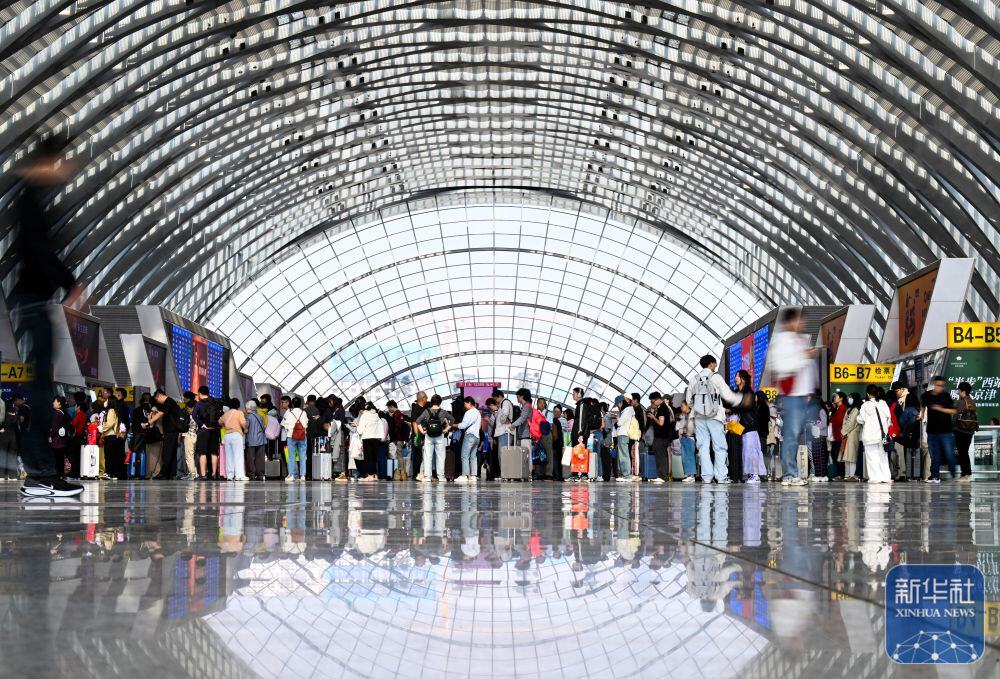 ↑ 10月7日,旅客在天津西站候车。新华社记者 赵子硕 摄