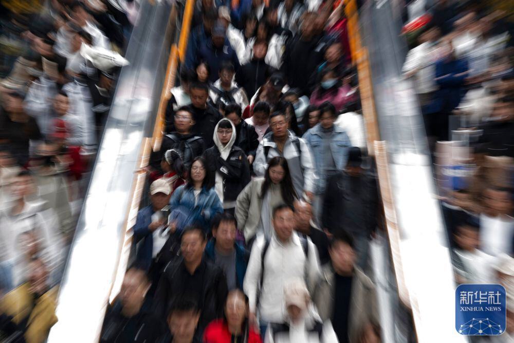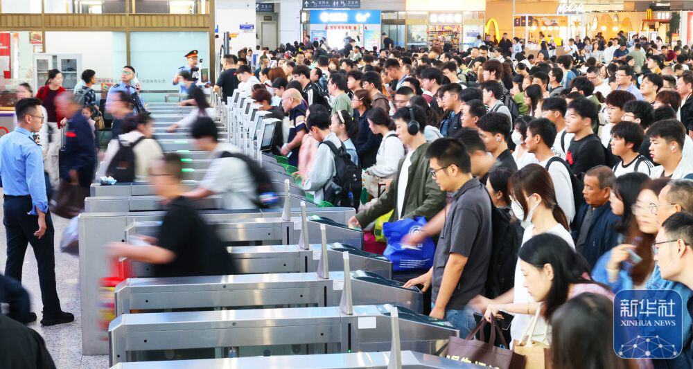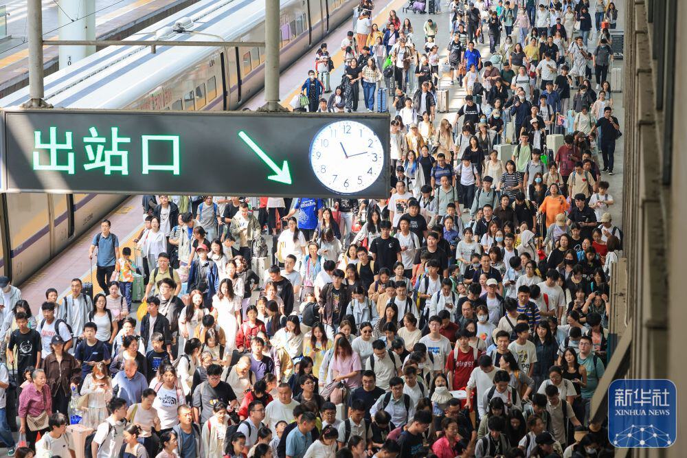↑ 10月7日,旅客在南京火车站有序出站。新华社发(苏阳 摄)