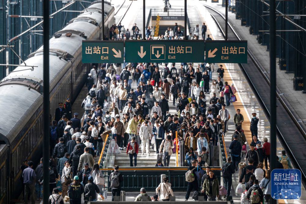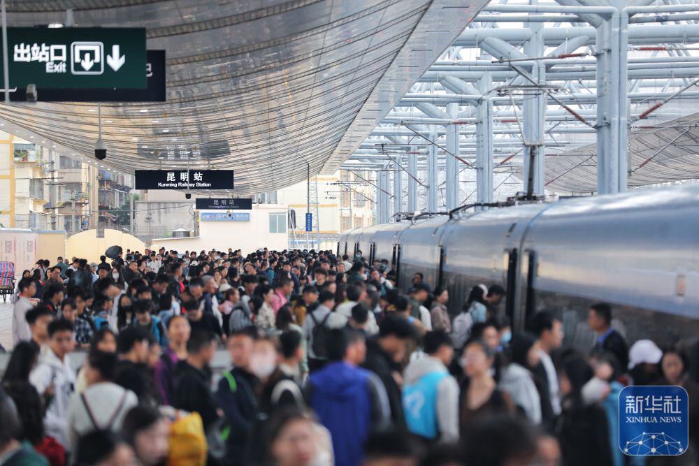 ↑ 10月7日,旅客在昆明站乘车。新华社发(杨紫轩摄)