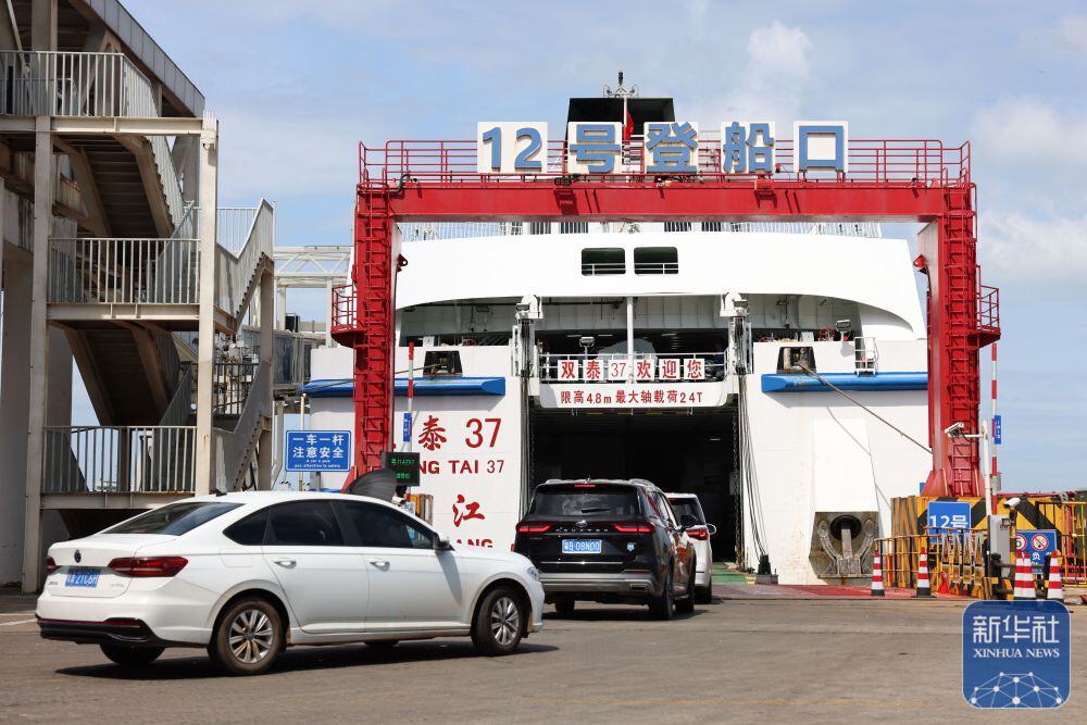 ↑ 10月7日,在海南省海口市新海港,车辆有序驶入客滚船。新华社记者 张丽芸 摄