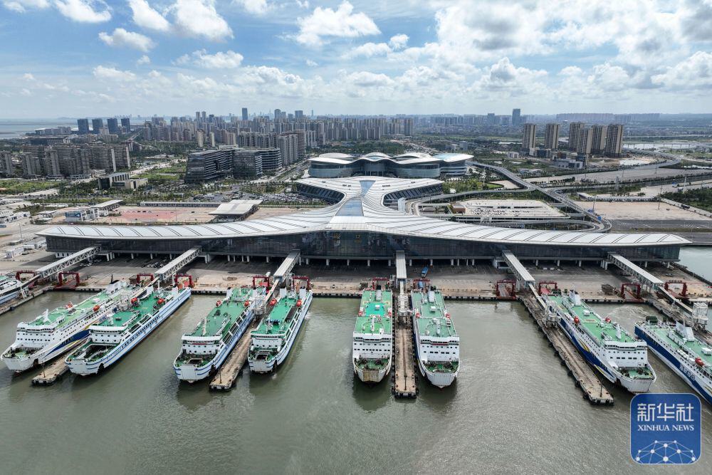 ↑ 10月7日,在海南省海口市新海港,车辆有序驶入客滚船(无人机照片)。新华社记者 张丽芸 摄