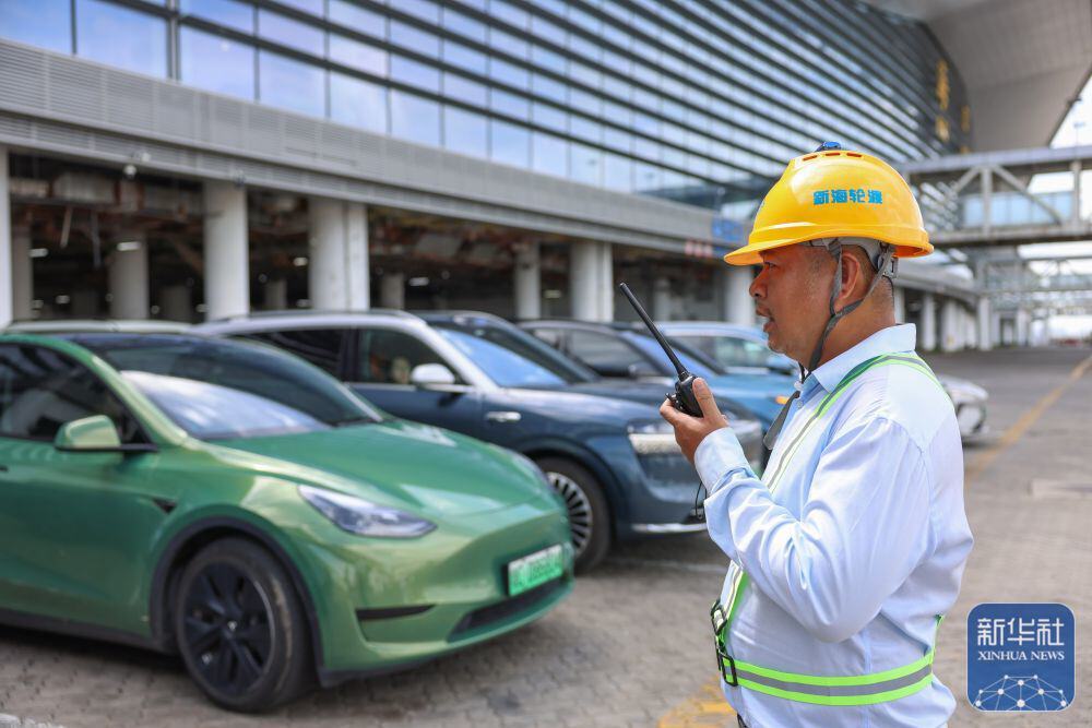 ↑ 10月7日,海南省海口市新海港的工作人员指挥汽车有序驶入客滚船。新华社记者 张丽芸 摄