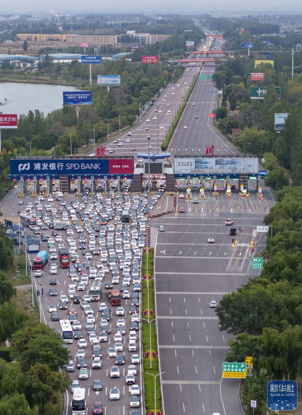 ↑ 10月7日拍摄的宁夏银川市银川东高速公路收费站车流(无人机照片)。新华社记者 杨植森 摄