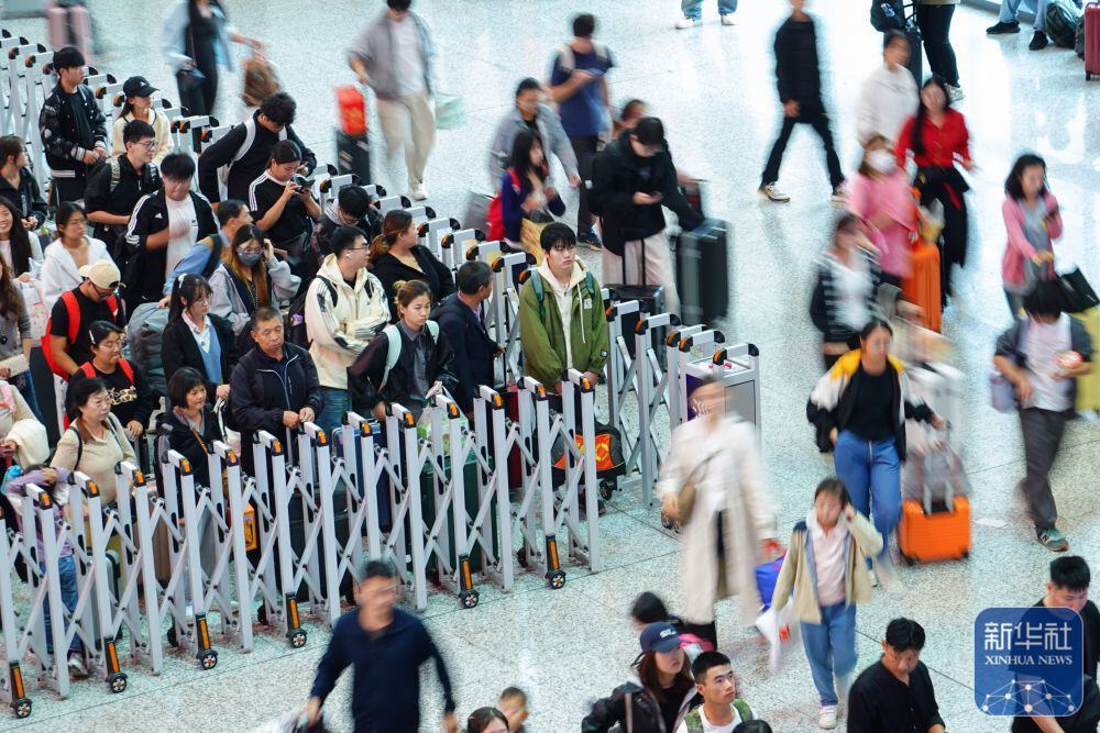 ↑ 10月7日,旅客在石家庄火车站候车大厅检票进站。新华社发(陈其保摄)