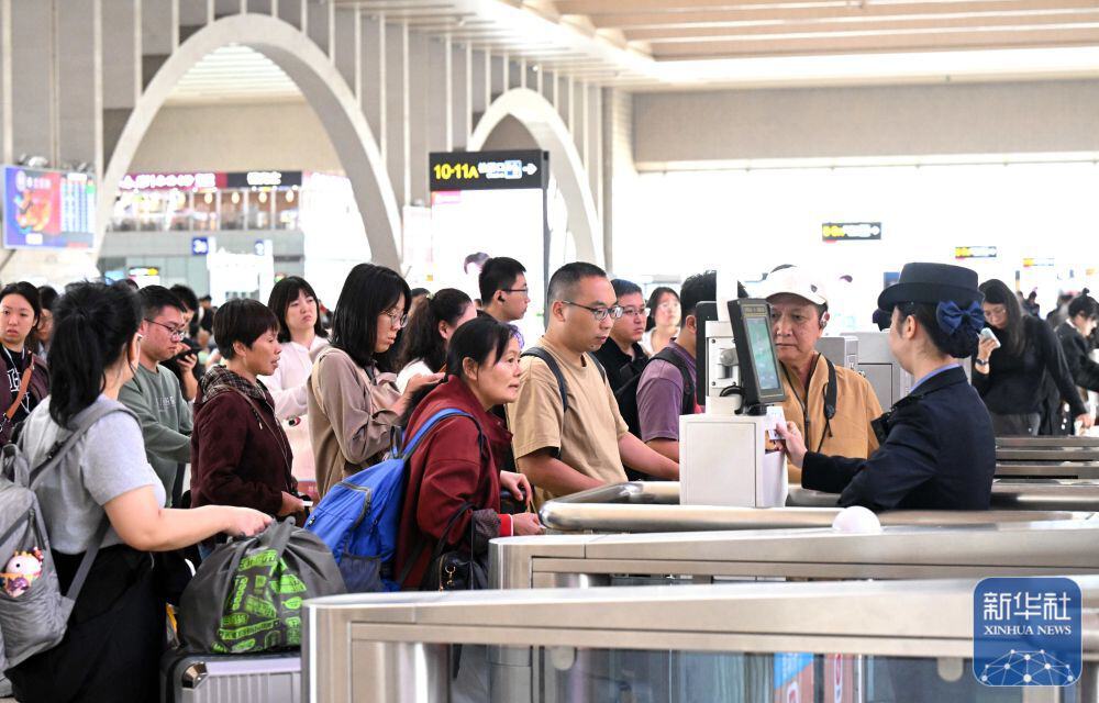 ↑ 10月7日,旅客在山东淄博站等候检票乘车。新华社记者 齐芷玥 摄