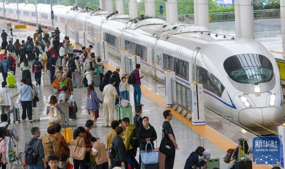 ↑ 10月7日,旅客在河南洛阳龙门站乘车。新华社发(张怡熙 摄)