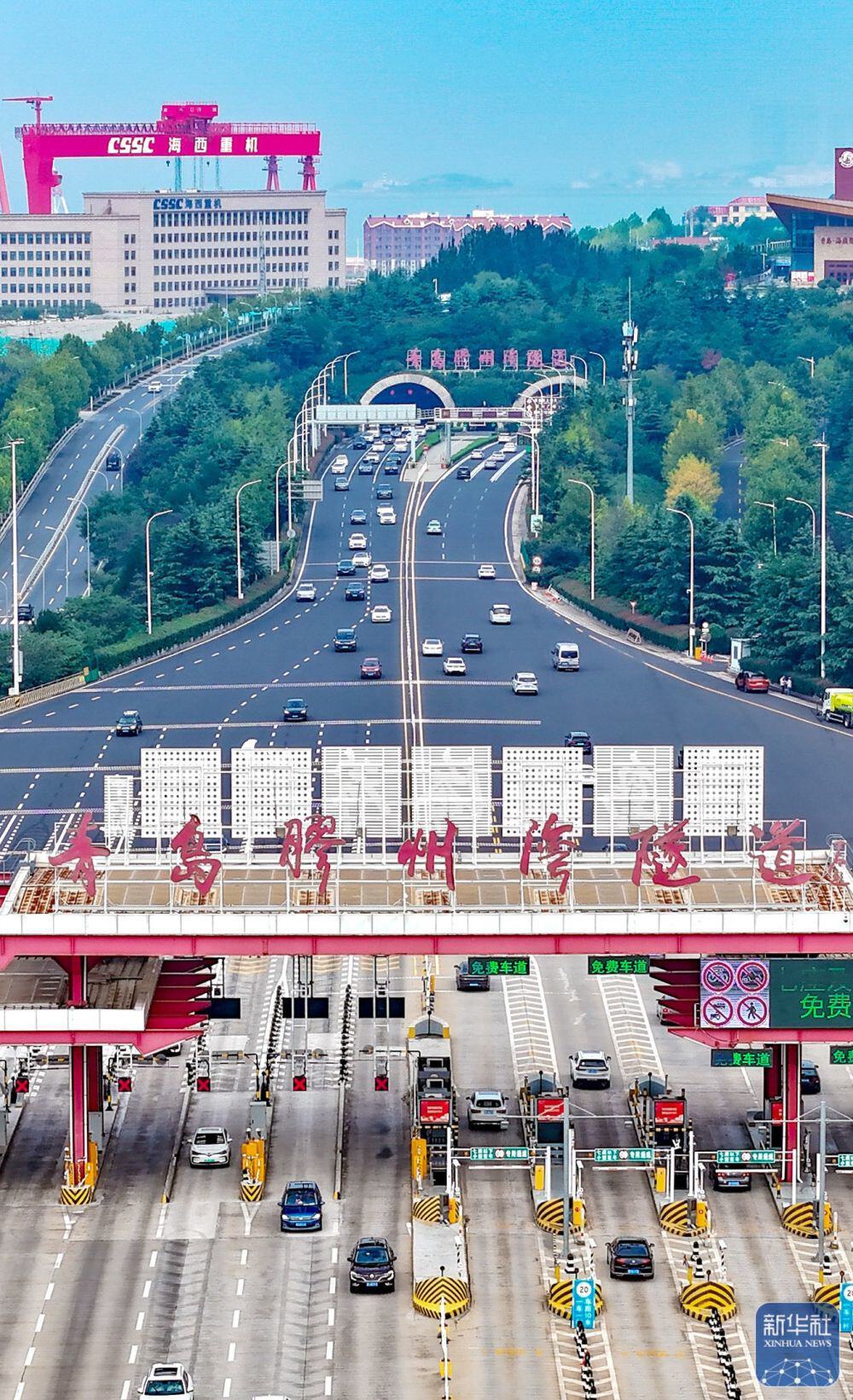 ↑ 10月7日拍摄的山东青岛胶州湾隧道车流(无人机照片)。新华社发(张进刚摄)
