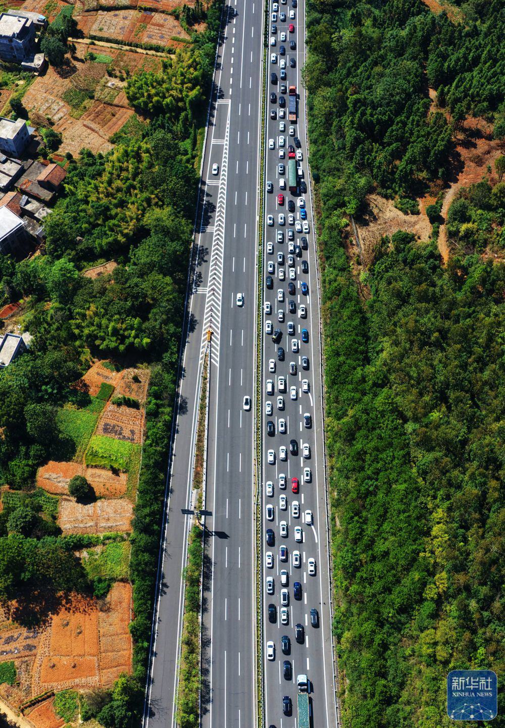 ↑ 10月7日,车辆在许广高速湖南省郴州市嘉禾县路段缓慢行驶(无人机照片)。新华社发(黄春涛 摄)