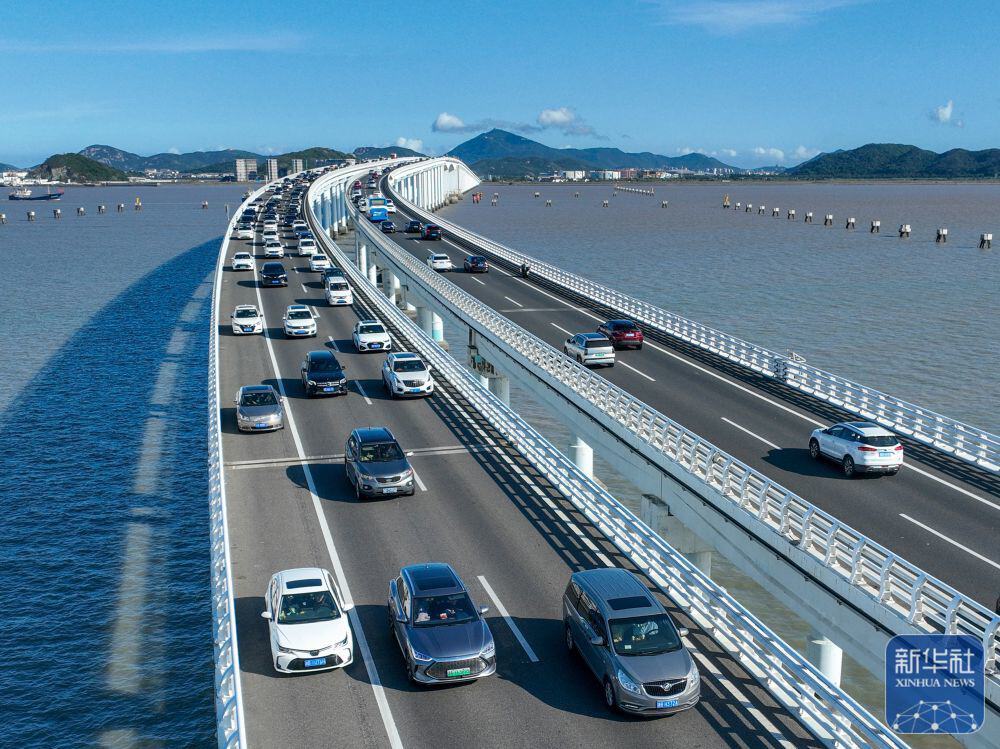 ↑ 10月7日,在浙江省舟山市普陀区,返程车辆行驶在朱家尖海峡大桥上(无人机照片)。新华社发(邹训永 摄)