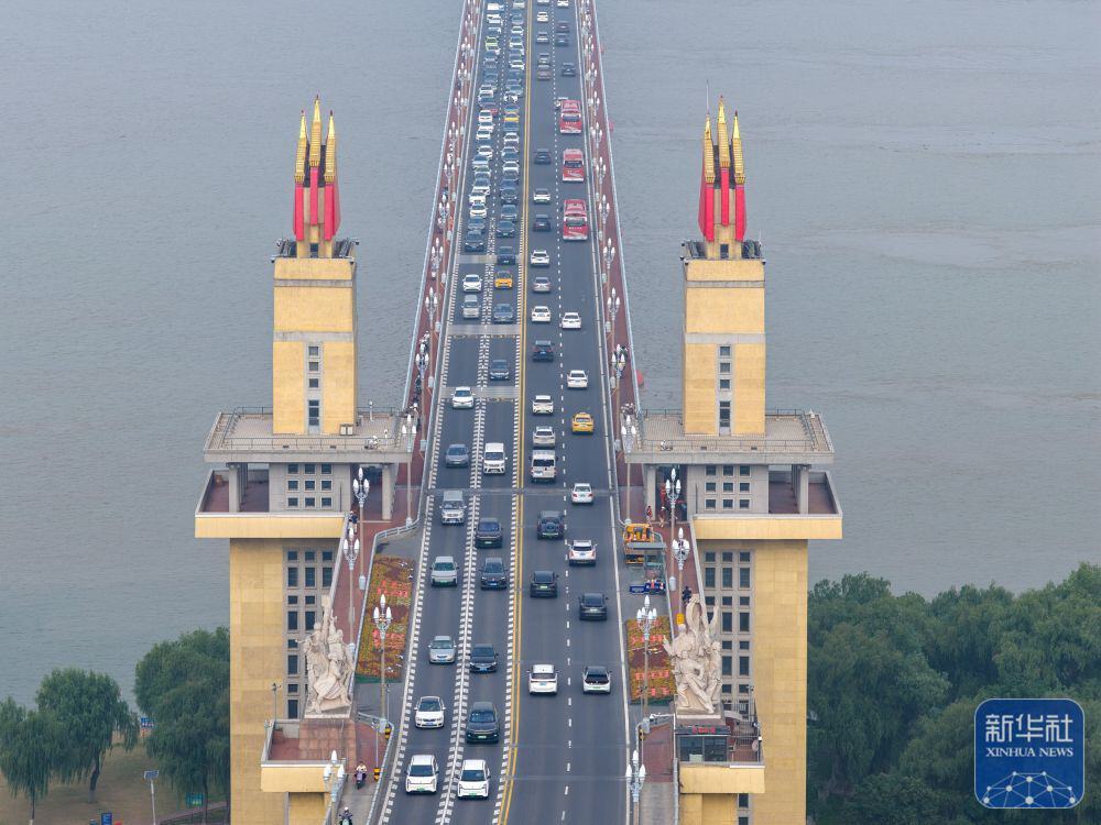 ↑ 10月7日拍摄的南京长江大桥上的车流(无人机照片)。新华社发(杨素平 摄)