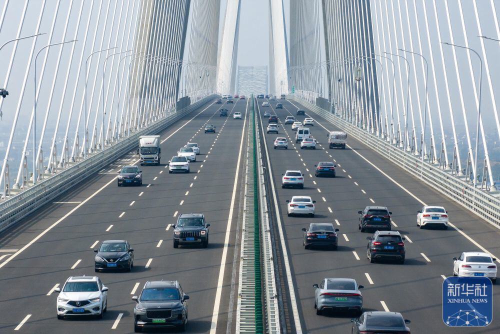 ↑ 10月7日拍摄的江苏常泰长江大桥车流(无人机照片)。新华社发(汤德宏摄)