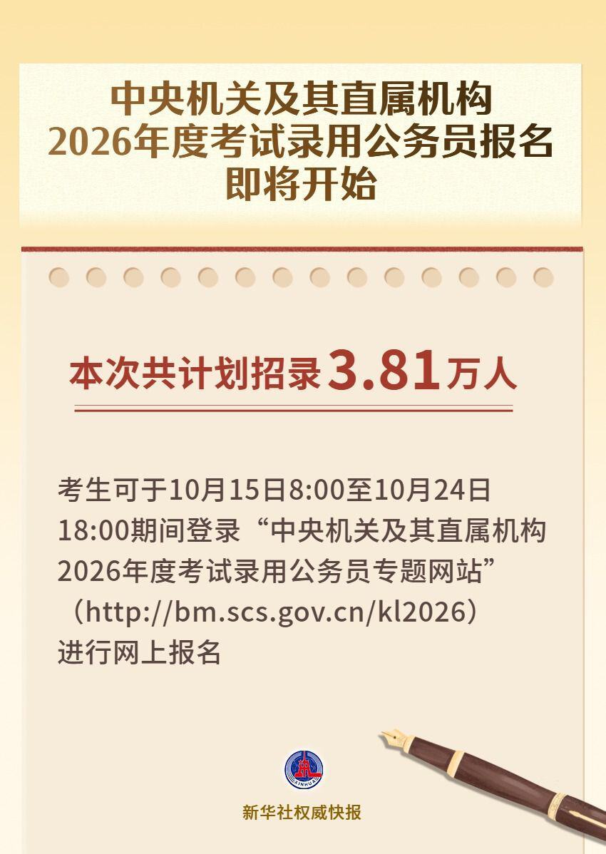 记者10月14日从国家公务员局获悉,中央机关及其直属机构2026年度考试录用公务员报名即将开始,共计划招录3.81万人。