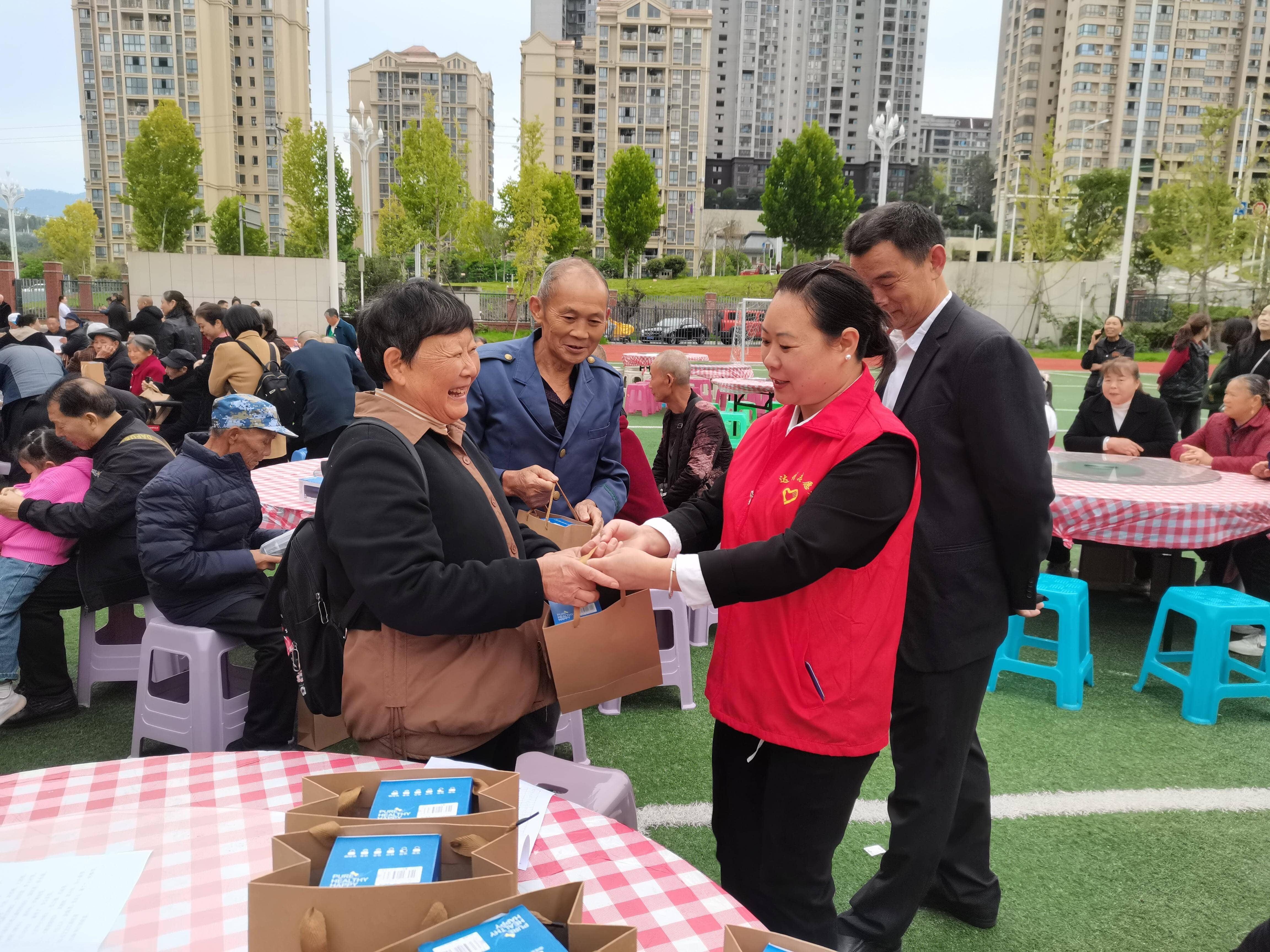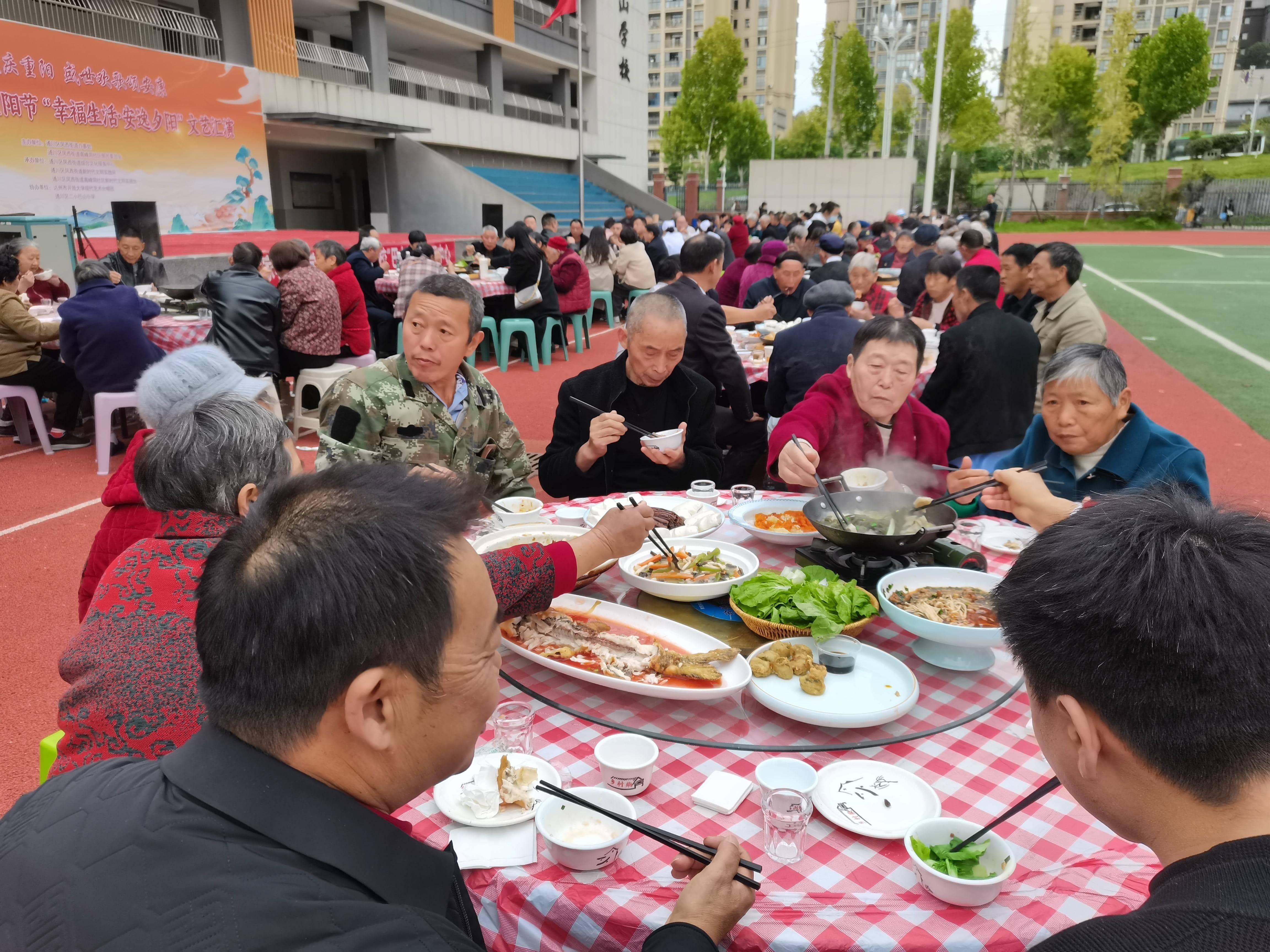 高峰洞社区则在“热闹”与“团圆”上做文章,除了精彩的文艺表演和贴心的义诊服务外,还特别筹备了一场热闹的“重阳坝坝宴”。工作人员与志愿者提前采购食材、精心烹饪,一道道热气腾腾的家常菜摆满餐桌。老人们围坐在一起,一边品尝美味佳肴,一边拉着家常,分享生活趣事,现场欢声笑语不断,俨然一场温馨的“家庭聚会”,让老人们感受到浓浓的邻里情与节日的幸福感。