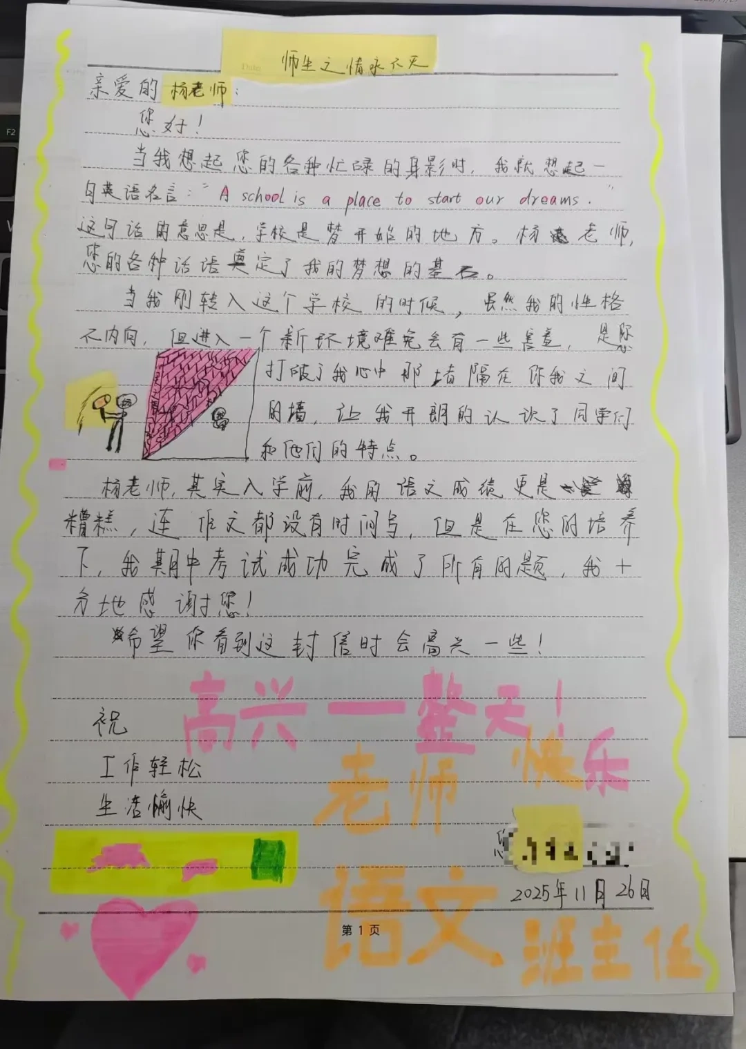 “教育是看见,是点燃。在鹏宇身上,我们看到了一个孩子如何在新环境中扎根、发芽、向着光生长。”班主任杨英老师说:“鹏宇的适应能力很强,性格开朗,像一颗小太阳温暖着班级。他在感恩节写给我的信里说:‘您打破了我心中的那堵墙。’其实我想说,是他自己勇敢地走了出来。第一次上台分享,虽然紧张,但已是了不起的突破。愿他永远保持这份真诚与勇气。”