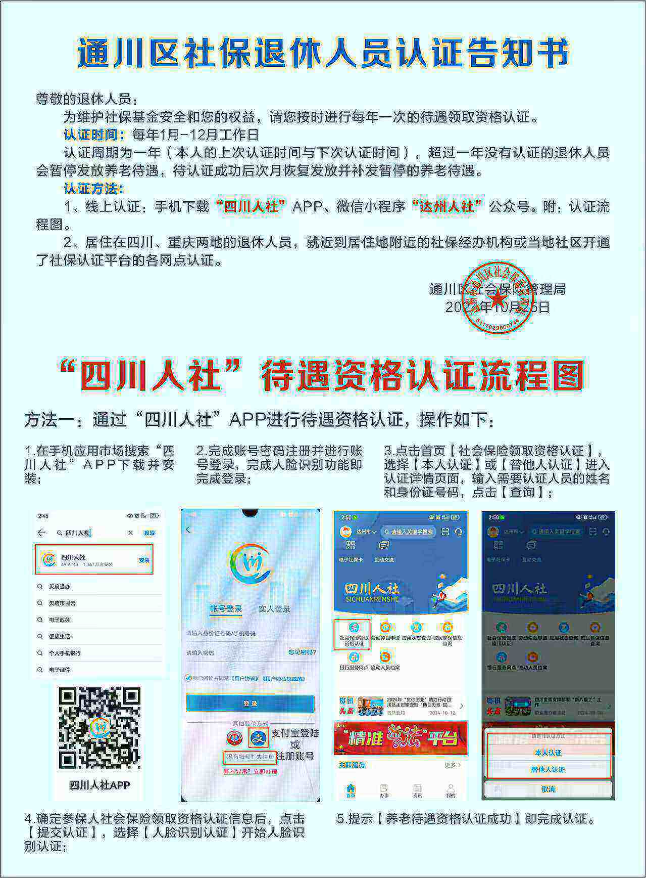 1.四川人社app:1.下载四川人社APP;2.完成账号注册;3.登陆并完成人脸识别;4.点击首页社会保险领取资格认证,选择本人认证或替他人认证;5.点击提交认证,选择人脸识别认证开始人脸识别认证;6.页面提示养老待遇资格认证成功。