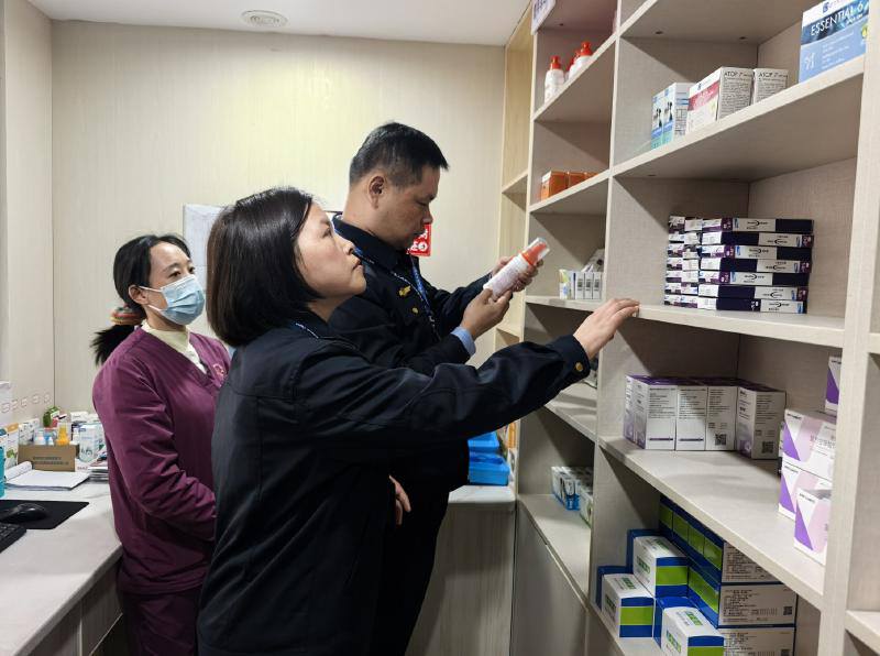 执法人员在宠物医院检查宠物药品。