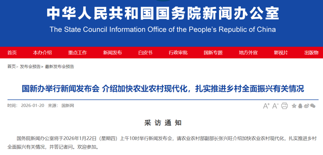 事关农业农村现代化 今天10时国新办将举行发布会 央视新闻客户端 2026-01-22 11:09 1126 国务院新闻办公室将于2026年1月22日(星期四)上午10时举行新闻发布会,请农业农村部副部长张兴旺介绍加快农业农村现代化,扎实推进乡村全面振兴有关情况,并答记者问。 打开微信“扫一扫”,打开网页后点击屏幕右上角分享按钮 评论 0 还没有添加任何评论,快去APP中抢沙发吧! 我要评论