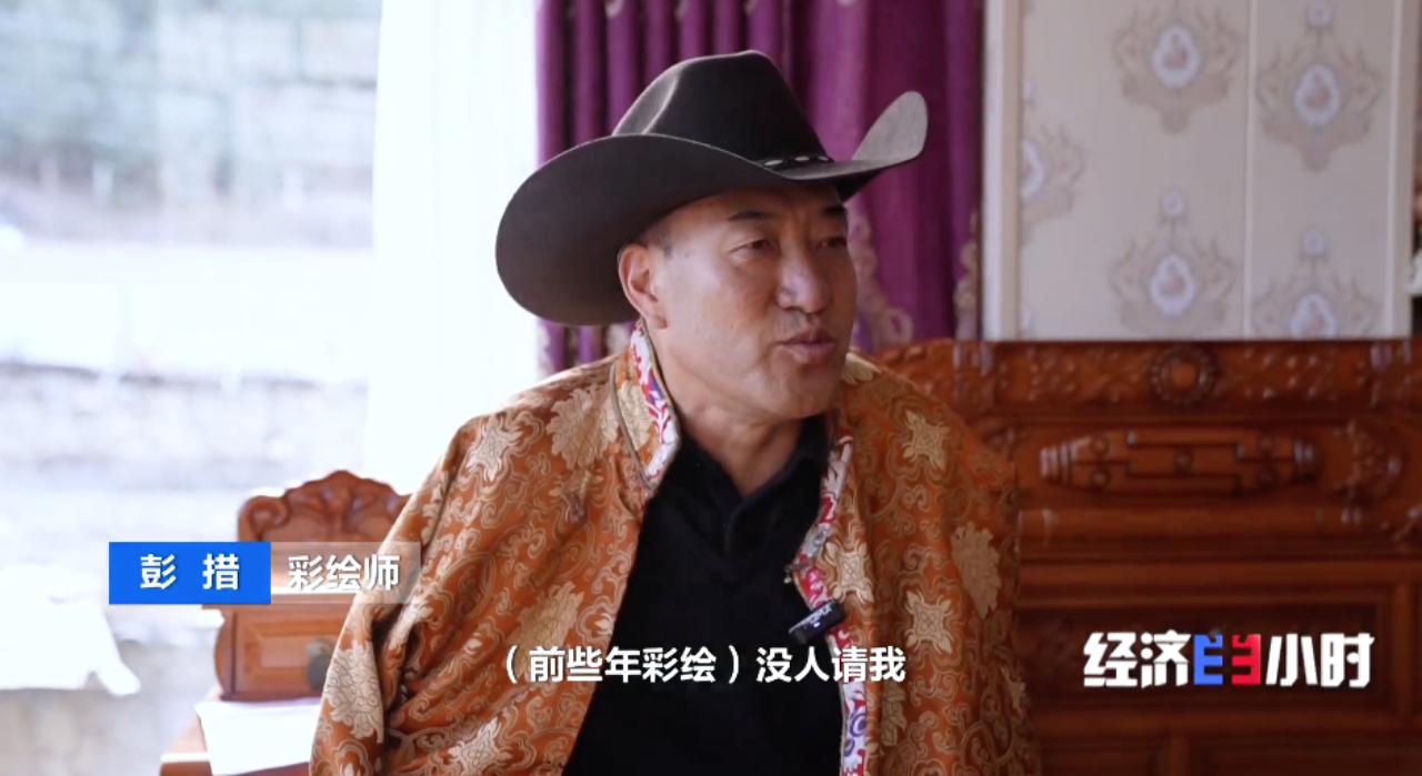 临近年关,四川甘孜藏族自治州炉霍县的村民家中,彩绘师彭措次里正手持画笔,为当地特色民居“崩科”上贺新年图样着色。