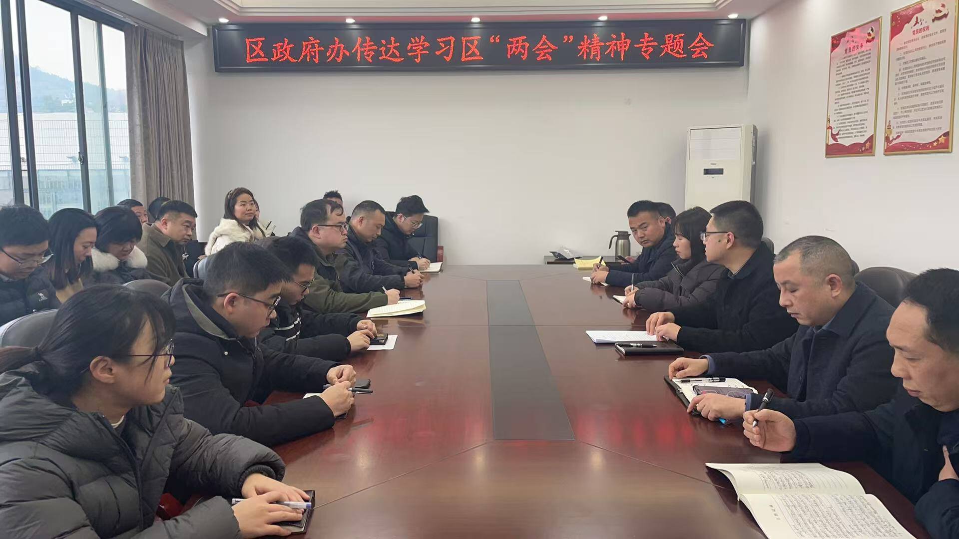 1月29日,区政府办召开专题会议传达学习两会精神,深入研读区政府工作报告及区委领导重要讲话,并研究贯彻落实举措。