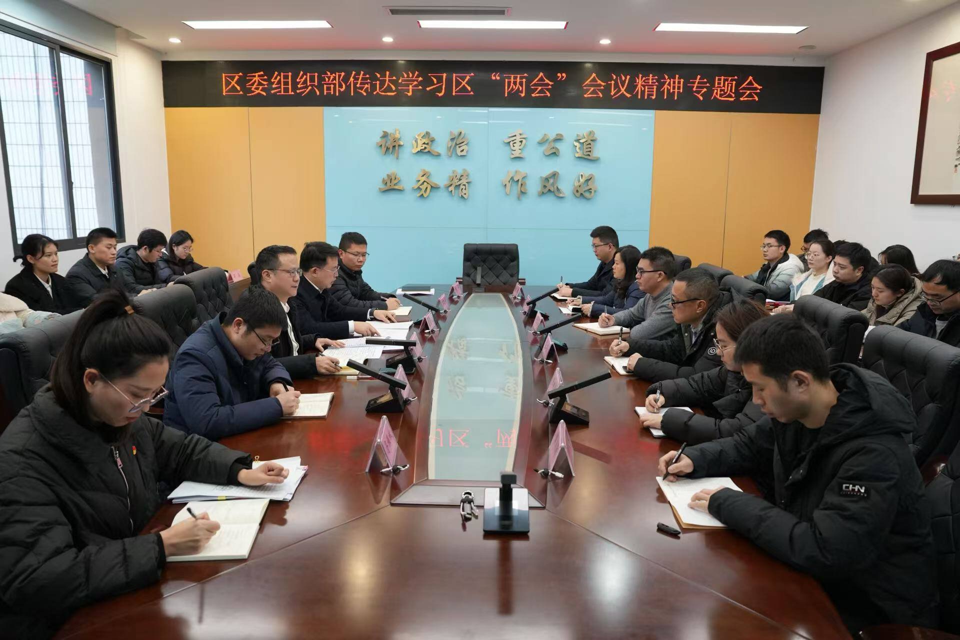 会议要求,要融会贯通、全面学习。将学习贯彻区“两会”精神同贯彻落实区委六届十次全会暨区委经济工作、城市工作会议部署要求有机结合,切实把思想和行动统一到区委区政府决策部署上来。要聚焦重点、狠抓落实。围绕区委区政府未来五年总体规划,聚焦产业升级、教育发展、城市更新、科技创新、养老服务等大事要事,扎实将区委区政府部署安排转化为“三办三服务”的实际行动,为全区高质量发展贡献坚实党办力量。要忠诚担当、履职尽责。巩固拓展深入贯彻中央八项规定精神学习教育成果,筑牢廉洁自律防线,坚持培训提升、实践锻炼、政治历练“三管齐下”,全方位提升办公室干部队伍政治三力、能力素质,切实增强守初心、担使命的思想自觉和行动自觉,着力打造最有党性、最讲政治、最高效率的模范机关,坚决当好区委“坚强前哨”和“巩固后院”。