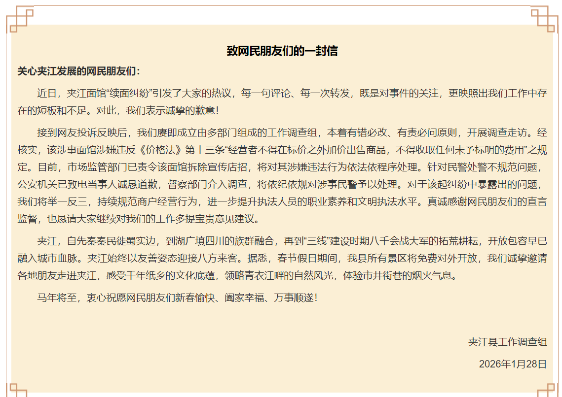 1月28日,“夹江发布”发布《致网民朋友的一封信》表示:接到网友投诉反映后,当地立即成立由多部门组成的工作调查组,本着有错必改、有责必问原则,开展调查走访。