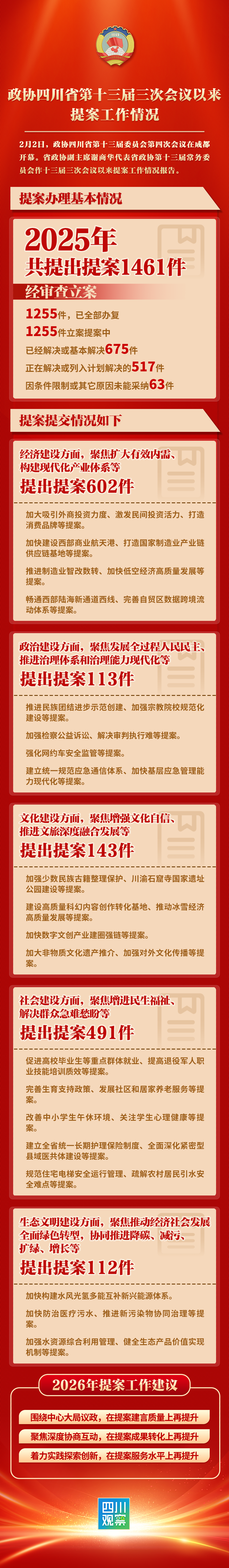 一图读懂丨政协四川省第十三届三次会议以来提案工作情况报告 天府融媒联合体 2026-02-04 15:03 107 2月2日,政协四川省第十三届委员会第四次会议在成都开幕。省政协副主席谢商华代表省政协第十三届常务委员会作十三届三次会议以来提案工作情况报告。 打开微信“扫一扫”,打开网页后点击屏幕右上角分享按钮 评论 0 还没有添加任何评论,快去APP中抢沙发吧! 我要评论