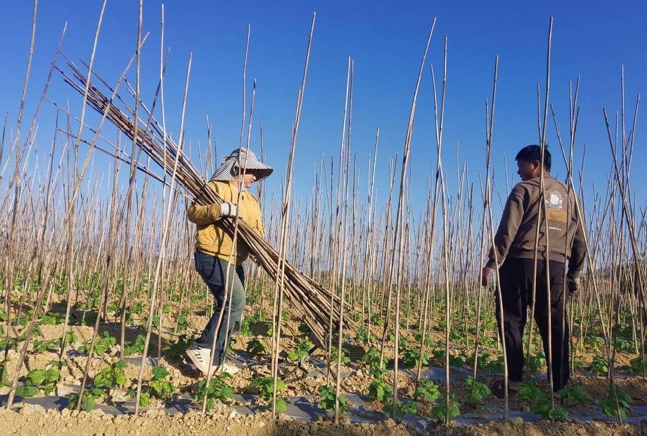 上午10点,在新街村灰怕浪村民组一处唤作红泥巴包包的半山坡上,普仕洋、张琼芳夫妇已经连续劳作了3个多小时,成果一目了然——今年新改造的2亩多新田上,立起了成片细密的豆架。