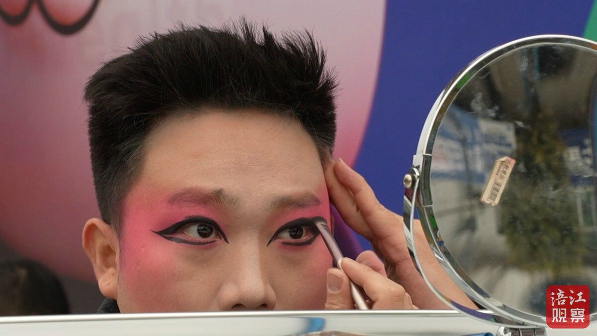 “我11岁开始学戏,如今二十年了,每年立春几乎都在路上。”他轻声说道,手中的笔不停。镜中人的脸庞逐渐被浓墨重彩覆盖,从素面到戏妆,像一幅徐徐展开的山水画。他今天要演的是川剧折子戏《射雕》中的角色,妆容格外讲究。