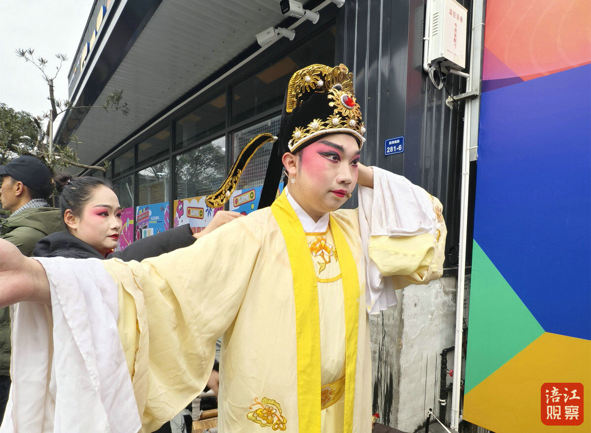 秀水镇钟秀里商业街的广场上,红色舞台早已搭好。虽然才上午九点,已有百余名村民自带小板凳等候。87岁的李大爷坐在最前排:“我小时候跟着爷爷赶过戏班子,后来几十年没见川剧下乡了,这两年又听到了锣鼓声,好!”
