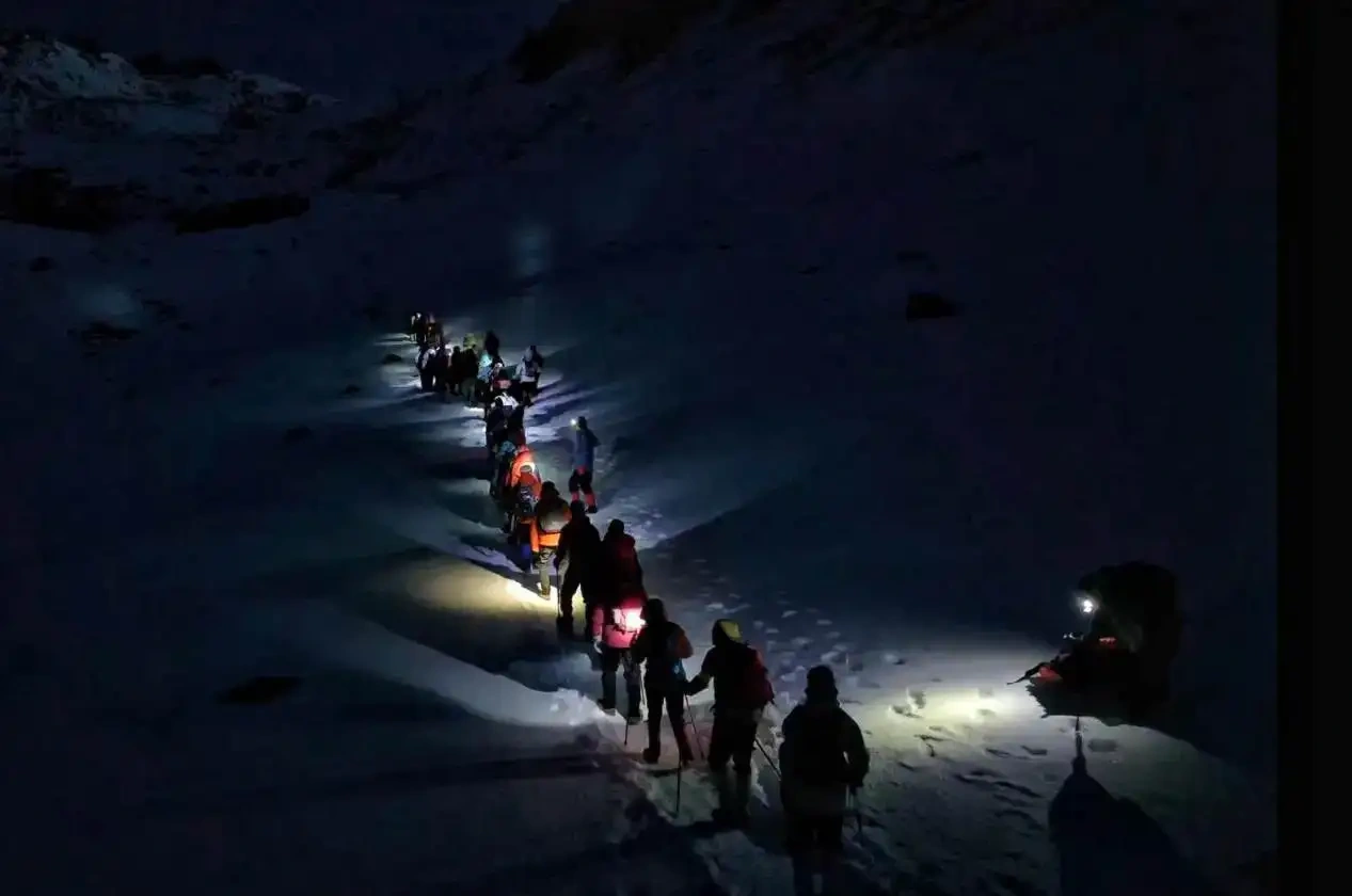 科学管理之下,三奥雪山奥太娜峰人气飞升。每天凌晨,登山客踏着夜色涌向景区,观光车在盘山路上串成长龙,载着人们奔赴海拔3800米的大本营;千百只手电筒次第亮起,聚成一条流动的光河,循着山路向顶峰蜿蜒攀升。