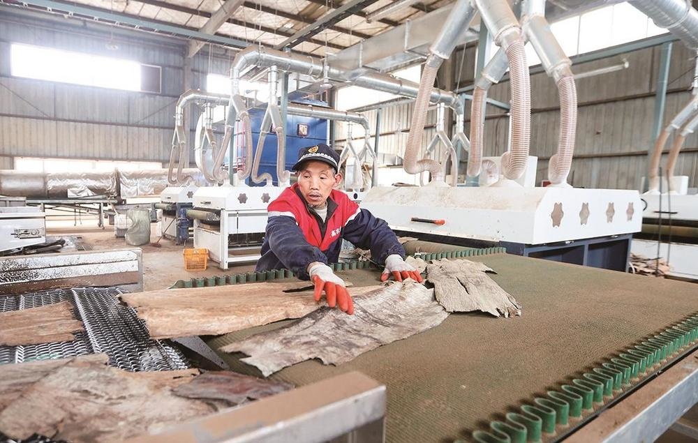 工人对杜仲皮压平整形。
